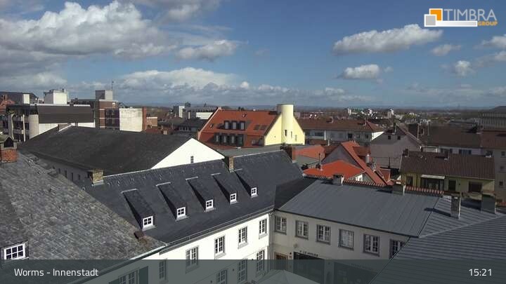 The webcam is located in the city center of Worms. The view wanders from the Magnus Church, behind which the towers of the Worms Cathedral St. Peter can be seen, over the roofs of the city to the Andreasstift and the city wall.