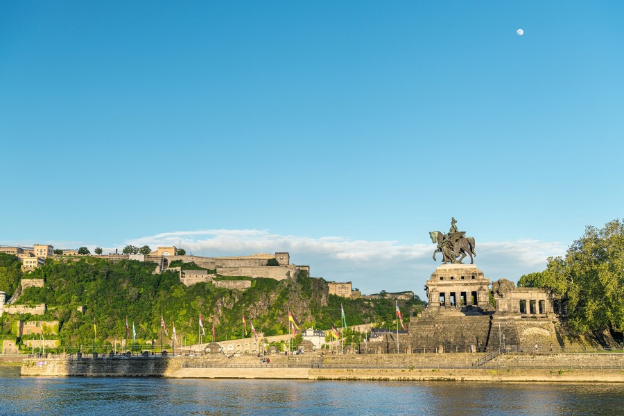 At the confluence of the Rhine and Moselle rivers lies the famous "Deutsches Eck" which translates to "German Corner", in Koblenz, one of the most iconic landmarks in Rhineland-Palatinate. The imposing Kaiser Wilhelm I. Monument on the river peninsula commemorates German unity and impresses with its size: the equestrian statue stands about 14 meters high, while the entire pedestal reaches approximately 38 meter.