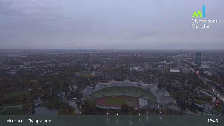 View from Olympic Tower in Munich. It shows the Olympic Park Munich, with its soccer stadium and the Olympic Hall. The Olympic Park is located in the northwest of Munich's city center.