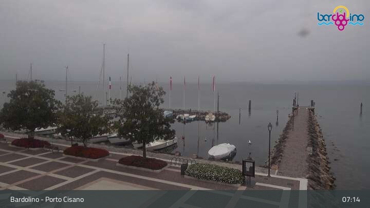 The camera is located on Lido Mirabello beach and looks north to the port of Bardolino on Lake Garda.