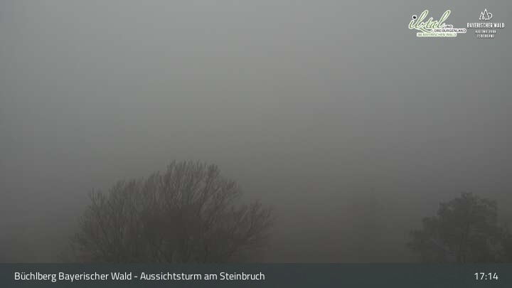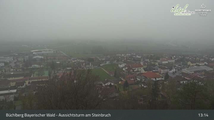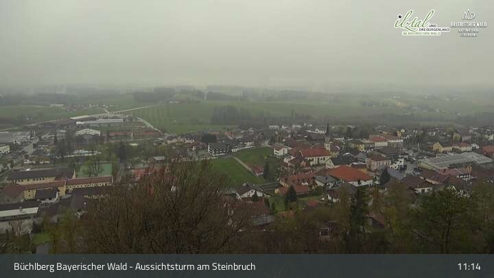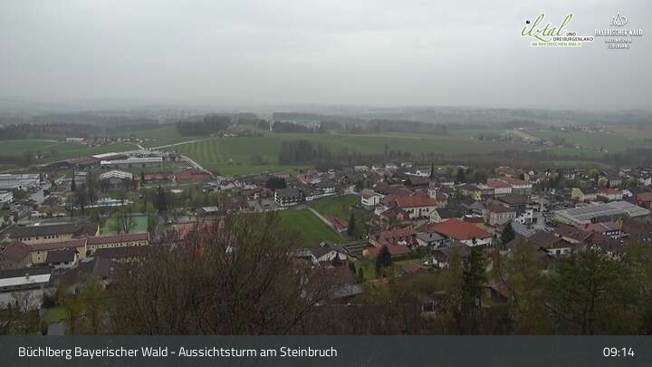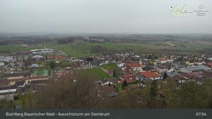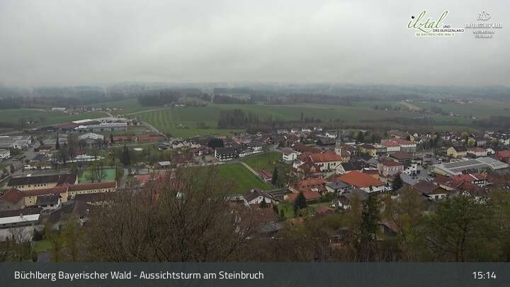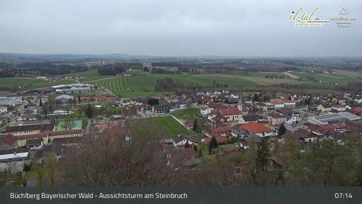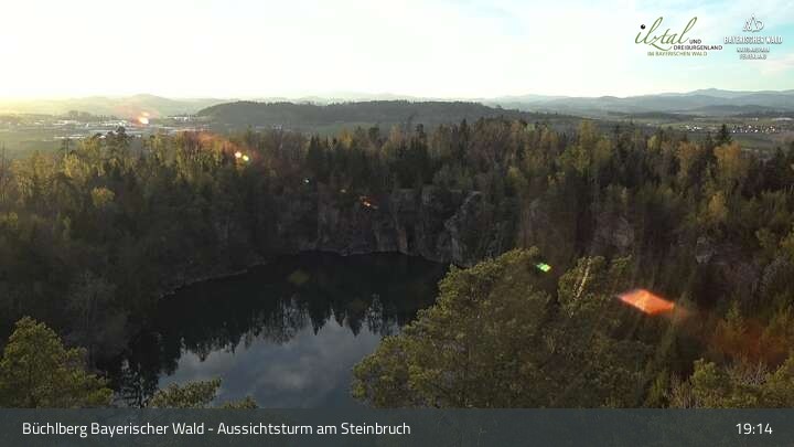 The camera looks from the lookout tower at the quarry over the village of Büchlberg and the quarry lake.