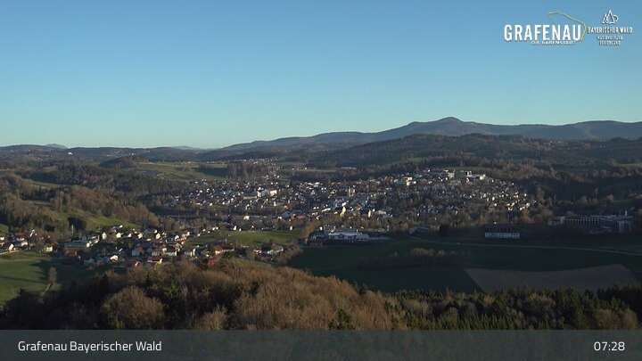 Enjoy the view of the climatic health resort Grafenau in the Bavarian Forest. The camera is located south of the town and looks north over the town to the Bavarian Forest National Park.