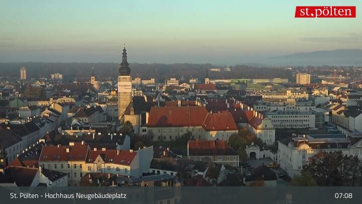 The webcam is located in St. Pölten on the roof of the high-rise building at Neugebäudeplatz and looks over the capital of Lower Austria. Among other things, you can see the building of the provincial government and the cathedral.