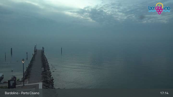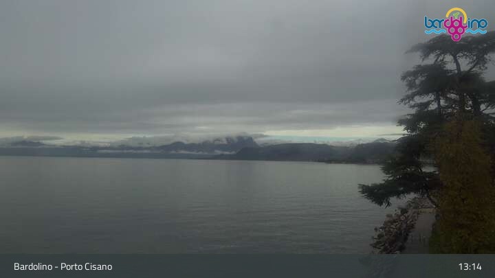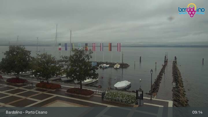 The camera is located on Lido Mirabello beach and looks north to the port of Bardolino on Lake Garda.